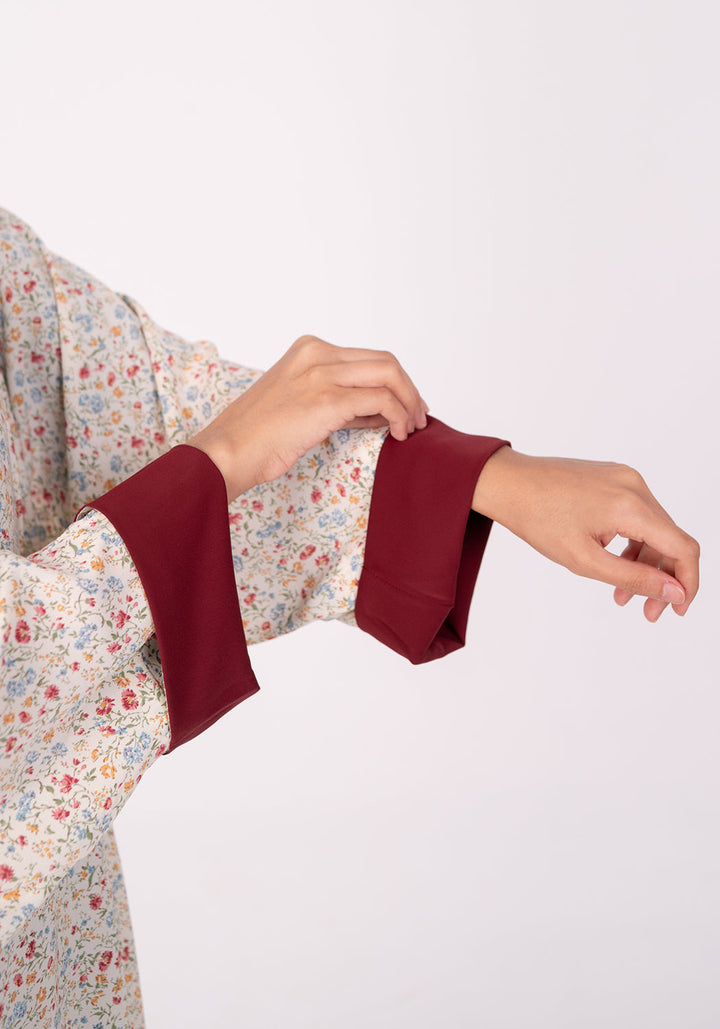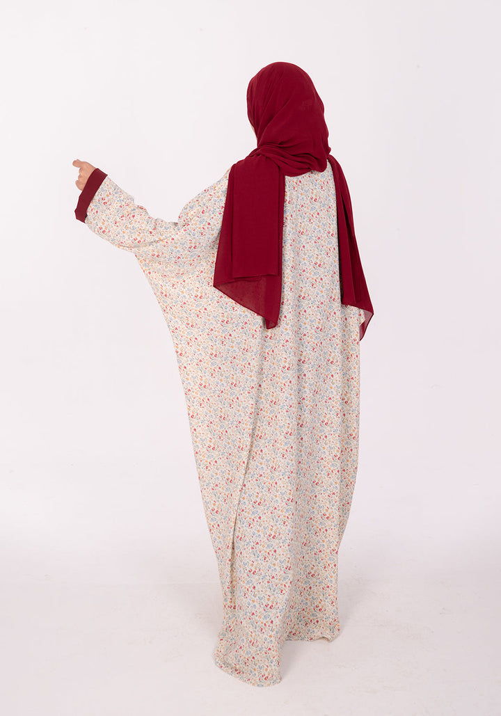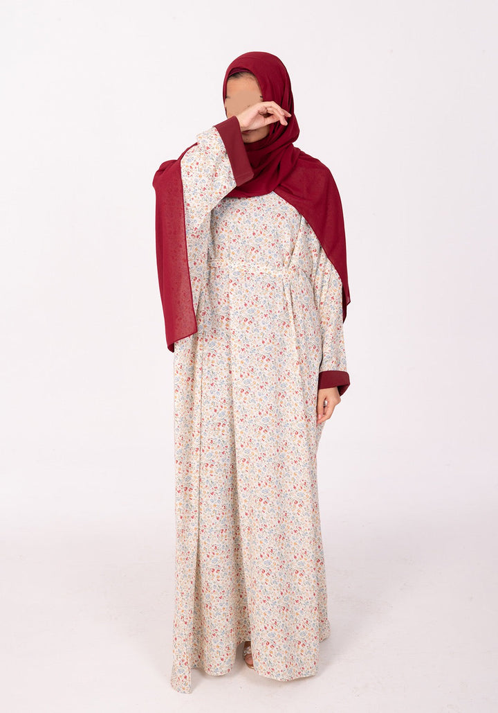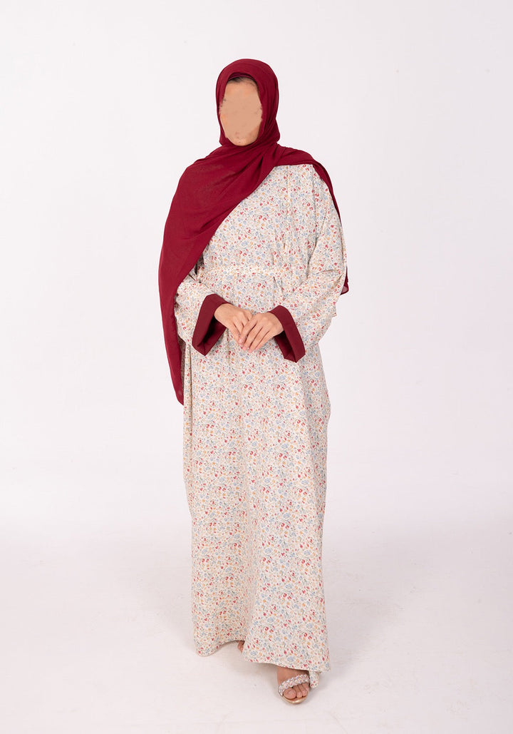 Design Details: An effortless everyday floral kaftan abaya with a baggy / wide fit and a removable belt to style as per your liking, with contrasting finish on the inside of the sleeves.